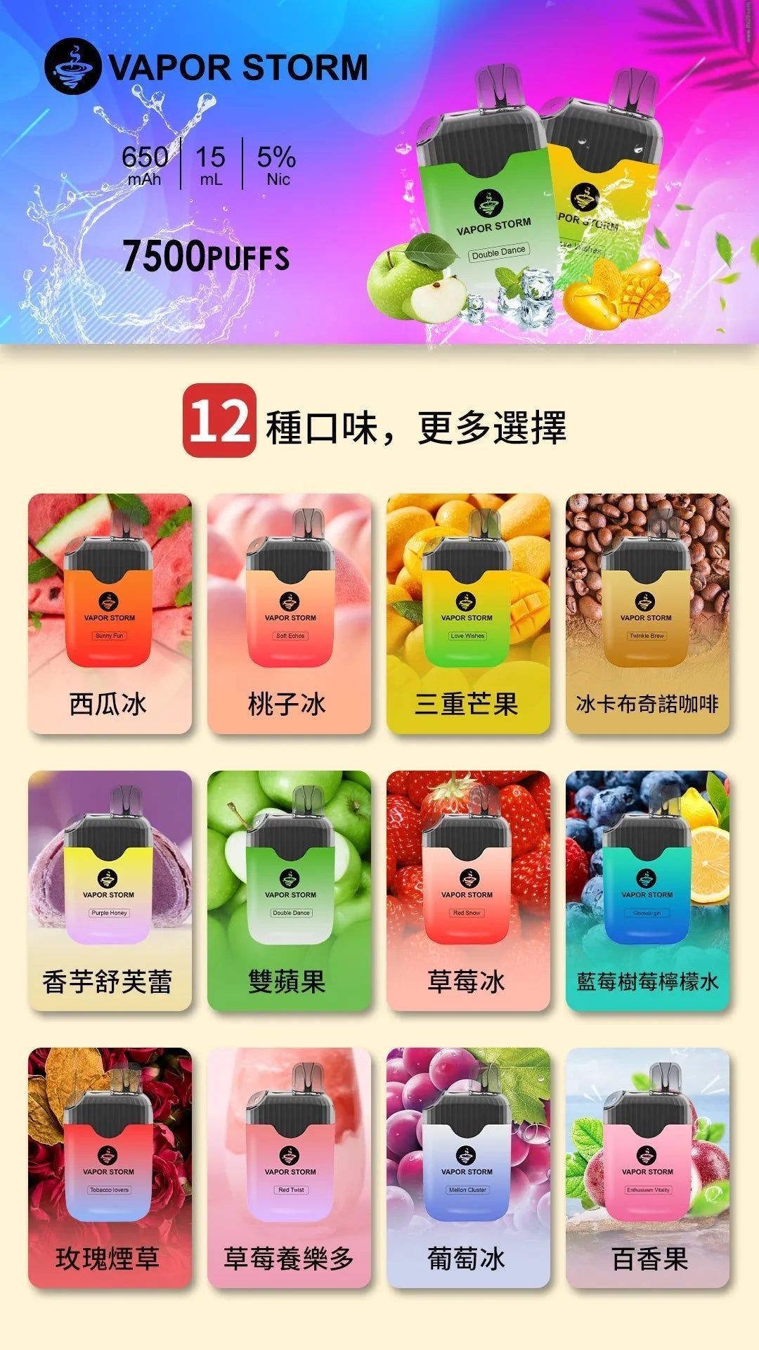 ✨無論您是追求便捷體驗的新手,還是講究口感層次的資深玩家,VAPOR STORM 7500都能為您開啟一場結合藝術與科技的電子煙之旅。準備好探索它的獨特風味,享受優雅且令人難忘的吸抽體驗了嗎?
